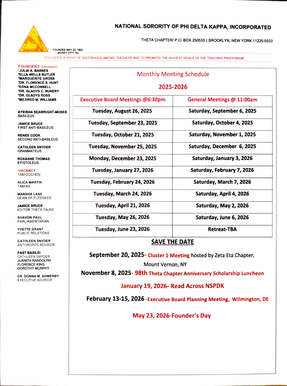 It was on Palm Sunday, April 1923, that Miss Gladys Merritt discussed the possibilities of a sorority Chapter in Jersey City. Of the eight teachers who attended, only one declined. Friday came and they voted in favor of a permanent organization which was incorporated by a Newark attorney, J. Mercer Burrell. Dr. G. E. Cannon, Mr. J. L. Merritt, Mrs. Lottie Cooper, and Mrs. Estelle Morris became their trustees. The date of incorporation was May 23, 1923 which has become our Founders´ Day. The Sorority spread from the East to the South, Midwest, Southwest, Far West, to Liberia in West Africa, and Barbados, West Indies.